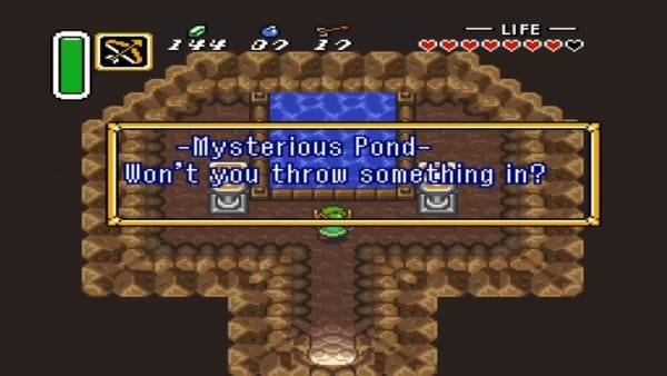 Inside this secret cave, the atmosphere is serene. Wade forward to the edge of a mysterious pond. A sign next to the water reads: “Throw an item in – see what happens.” This is one of Hyrule’s great fairy fountains, sometimes called the Mysterious Pond. Here, a friendly Great Fairy offers to upgrade certain items if you prove honest about dropping them in. Stand at the water’s edge and face the pond. When prompted, select an item from your inventory to throw into the water.