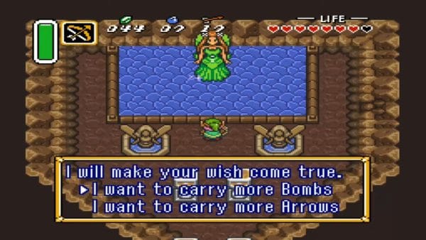 At the Pond of Happiness, choose to toss in Rupees – you can start with increments of 5 or 20. After you’ve thrown a total of 100 Rupees, the benevolent fairy Queen Venus emerges and asks if you’d like to carry more Bombs or Arrows. Select “Bombs,” and Venus grants you an increased bomb bag. Your maximum bomb capacity rises from 10 to 15 bombs. (If you had chosen arrows, your quiver would increase from 30 to 35 arrows instead.)