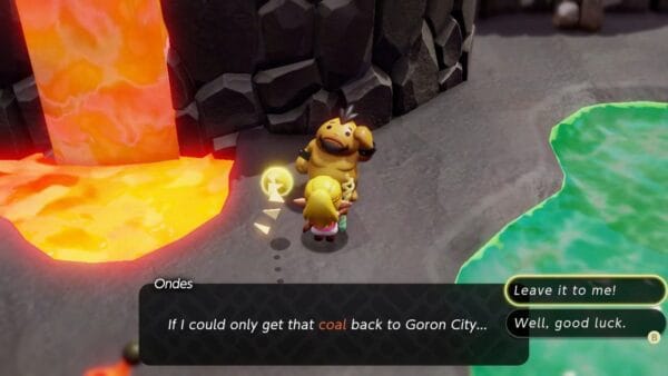 Initiate the Quest: After completing “The Rift on Eldin Volcano,” locate Ondes near the hot springs above the Lizalfos Quarry. He is lost and requests your assistance in delivering a flaming piece of coal to Limme at the entrance of Goron City.