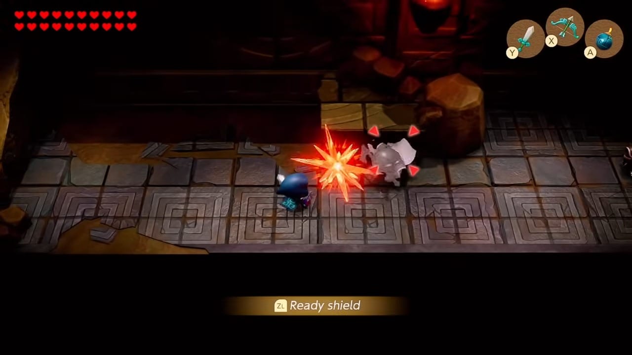 Almost immediately, you encounter resistance: a pair of armored Darknut guards block a doorway ahead, their heavy blades gleaming. Lock onto the first Darknut by holding your shield at the ready – the Darknut lunges, but its strike bounces off your shield with a clang, leaving it momentarily stunned. Seize that moment and strike with your sword, felling the foe. A second Darknut approaches; alternatively, you can try one of Link’s clever tricks. By pressing and holding the bomb button, Link pulls out a Bombchu – a small mechanical bomb that scurries along the ground. Release it and watch it race under the Darknut’s defenses, exploding at its feet. With both guards defeated, proceed up the stairs and into the next chamber.