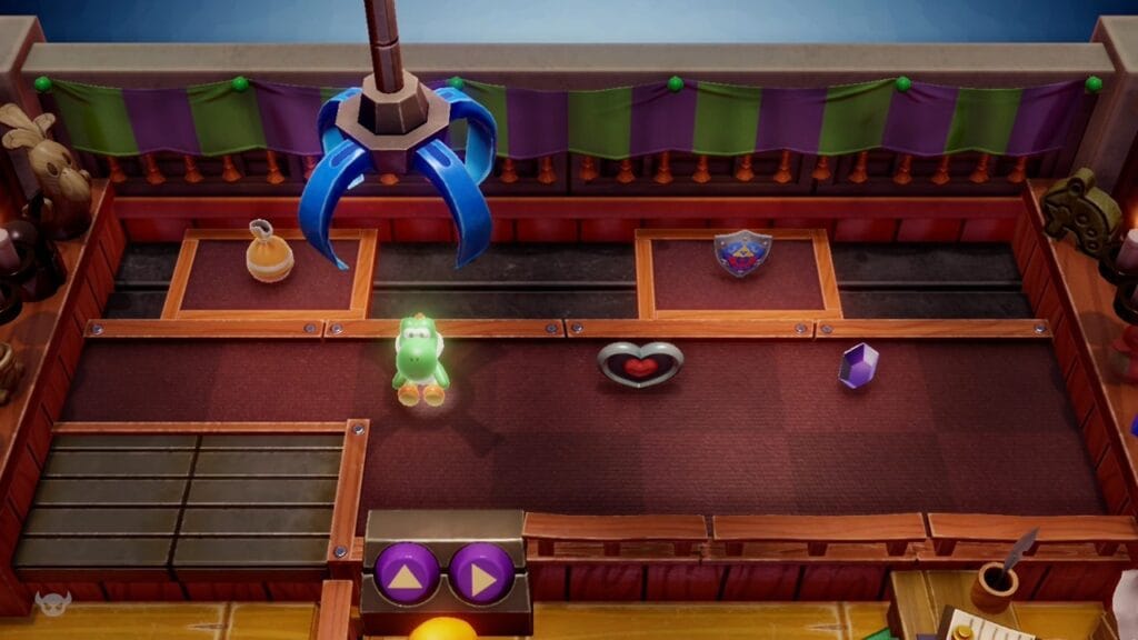 How? Pony up 10 Rupees and test your skill (or luck!) at the crane game. Snag that Yoshi Doll sitting right there. Easy first step!