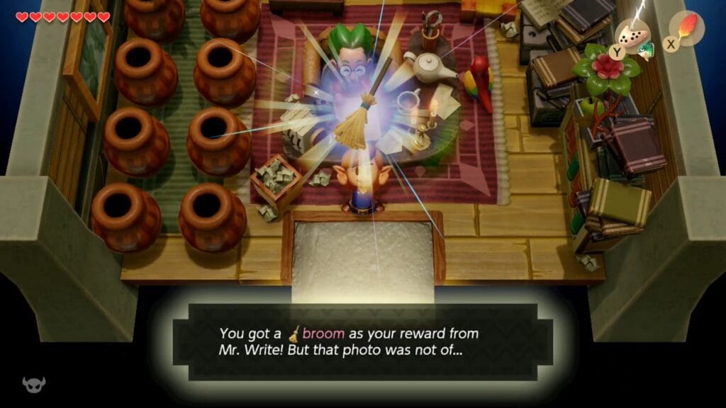 What? Give Mr. Write the Goat’s Letter. He’s thrilled, especially by the photo inside (which is hilariously not Christine, but Princess Peach!). As thanks, he hands over the only thing he has: a Broom.