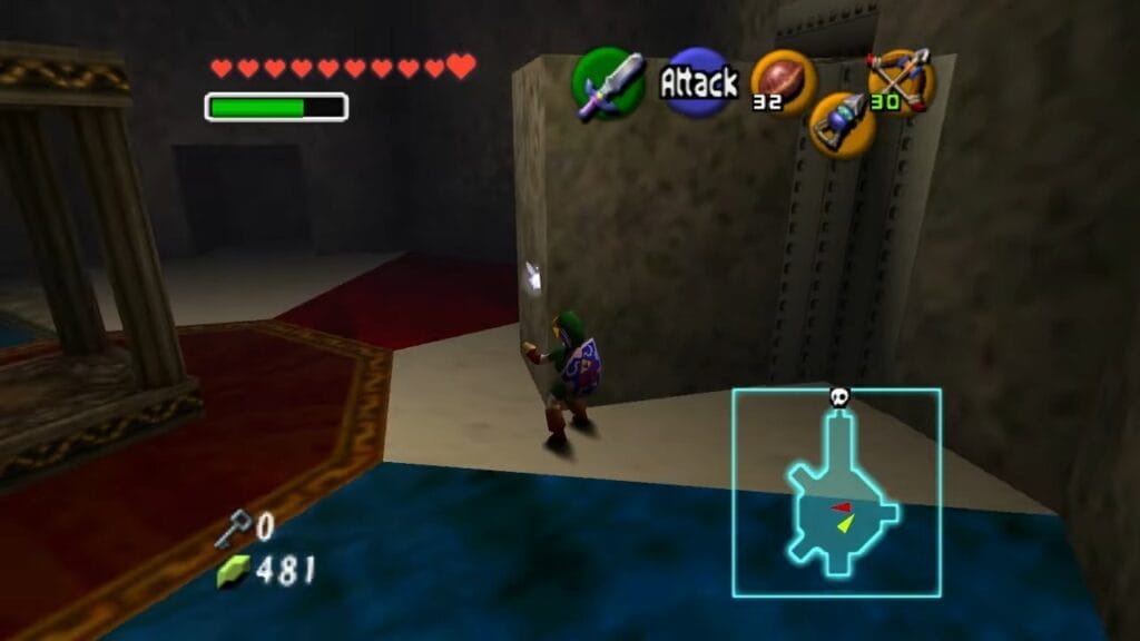 From where Gold Skulltula #61 was located, there’s a similar room on the east side of the temple that also contains a Gold Skulltula. Look for it on a small “island” in the water and retrieve Gold Skulltula #62.