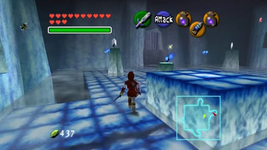 Our path forward involves navigating this frozen fountain. Step onto the altar where the magnificent Jabu-Jabu once resided. From there, you’ll need to jump onto the series of floating icebergs that now dot the area. These platforms are your stepping stones to the other side. As you hop across the ice, be mindful of the Octoroks that inhabit this frozen space.