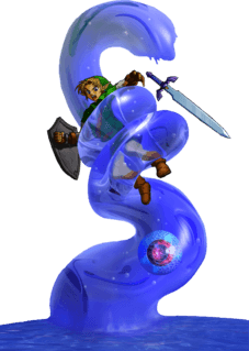 Now, sink down into the water and pass through the space where the block once was. Climb back up on the other side. You’re now in a small room. Locate the crystal switch and strike it with your sword. This will cause a water pillar to rise. Quickly jump onto the pillar and then across to the other side of the room, ignoring the Tektite for now, and head through the door.