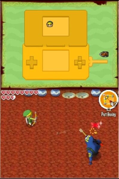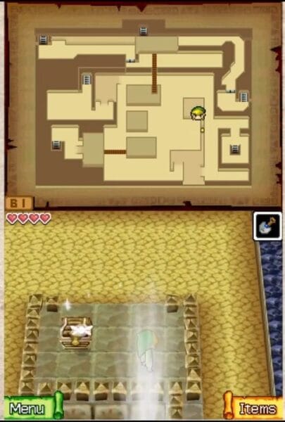 Details: This clever puzzle plays on the name and shape of the island, resembling a Nintendo DS. On the west side, strike a small statue. It cryptically mentions something buried “under the lower screen’s Menu button.” Think about your DS console – the Menu button (often interchangeable with Start/Select functionality depending on context) is typically at the bottom-left of the lower screen area. Drop into the southern pit on the island and dig in the very bottom-left square of dirt. Unearth a Courage Gem!