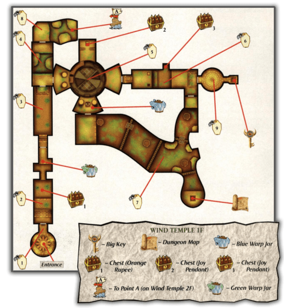 You’ll now stand before the final stone seal. Play the Wind God’s Aria one last time, and Makar will join you on his fiddle. The final door unlocks. Before moving on, don’t forget to blow the lid off the warp cauldron nearby—it’ll save you time if you need to return. Stock up using the pots around the room: you’ll find hearts, magic jars, and even fairies. When you’re ready, unlock the final door using the Big Key and prepare for the Wind Temple’s boss.